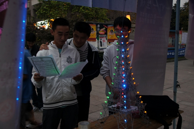 5点,场地布置完毕,现场开始响起动感的音乐,和着彩灯闪烁的光亮,颇有一番情趣。路过的同学放慢脚步,有的指指点点仔细评价,有的拿出手机留影纪念。随即,彩灯创意大赛暨感恩灯会展示活动正式开始,主持人开始介绍本次灯会活动,更多同学聚了过来,现场有些拥挤。接着,E志者们走到同学之中,以电阻为选票,让同学们选出最心仪的彩灯。