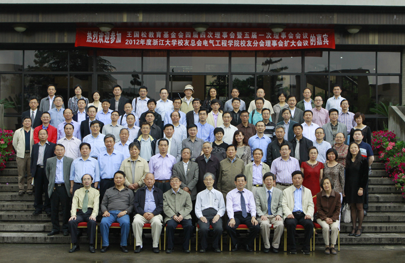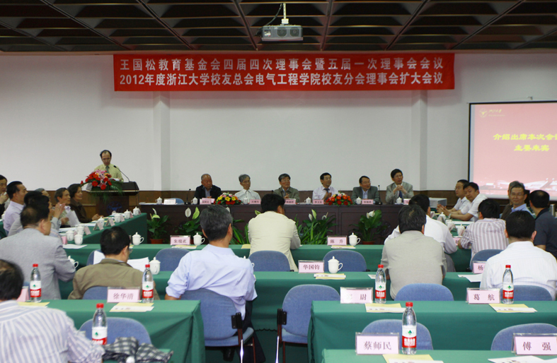 2012年5月20日,正值浙江大学115周年校庆庆典之日,浙江大学王国松教育基金会四届四次理事会暨五届一次理事会会议暨2012年度浙江大学校友总会电气工程学院校友分会理事会扩大会议在浙江大学玉泉校区邵逸夫科学馆隆重举行。中国科学院院士韩祯祥、中国工程院院士汪槱生、浙江大学工学部副主任徐德鸿、浙江大学工研院院长赵荣祥、电气工程学院常务副院长韦巍、电气工程学院党委书记王瑞飞、浙江省电力公司总经理李卫东、浙江省电力公司原总经理陈积民、王国松先生的女儿王遵雯、王国松教育基金会的理事、电气学院校友分会理事、学院师生共计100余人出席了大会。