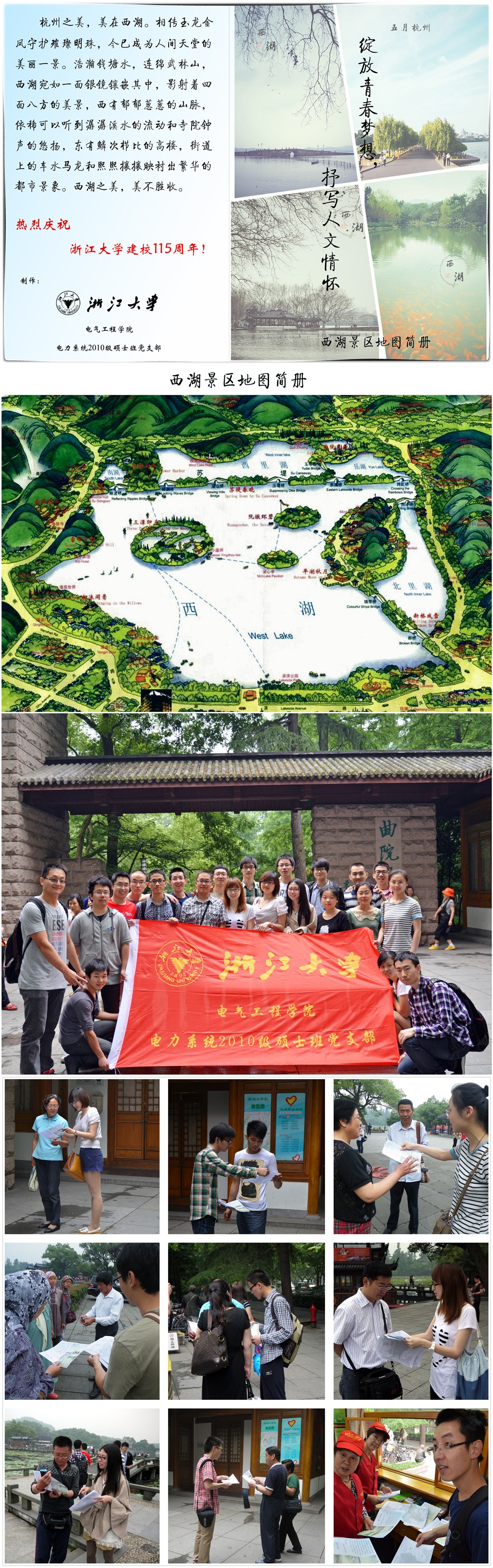 杭州之美,美在西湖。西湖像慈母一般怀抱每一个身在杭州的人,滋润每一颗浙大学子的心。为了让市民们更加了解西湖,让游客们更加熟悉西湖,我们电力系统10级硕士生党支部开展了“绽放青春梦想,抒写人文情怀”系列活动。活动分为两个部分,西湖景区地图简册设计比赛与西湖景区地图免费发放活动。本次活动一方面发挥高校服务社会的职能,表达浙大学子对西湖的崇敬和热爱,另一方面也是弘扬浙大的人文关怀精神,为浙大115周年华诞献礼。