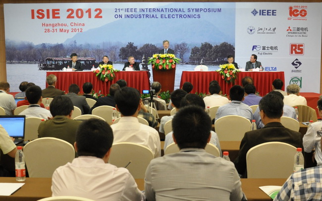 2012年5月29日上午,由国际电气及电子工程师协会(IEEE)工业电子分会主办、浙江大学承办的第二十一届IEEE国际工业电子研讨会(ISIE2012)在秀丽怡然的钱塘江畔天元大厦国际会议中心隆重开幕。来自美国、日本、丹麦、法国、西班牙、澳大利亚等几十个国家、地区及国内近300名学者参加了开幕式。