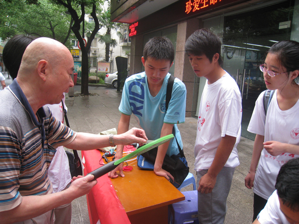 在社区公共服务工作站负责人的帮助下,队员们在工作站前的空地上摆开三张木桌,桌前围起“深入社区免费维修电器”的鲜红横幅。刚忙乱着从专业的工具箱里摆出电烙铁、万用表、各种螺丝刀、小元件,清一色白底红字实践队服和阳光的笑脸就吸引了来往居民的注意。步行的骑车的都停下脚步,几位老先生走近饶有兴致地询问我们可以修什么,笑着抱怨自家的收音机、电脑。得到我们“拿到这里我们帮忙修”的热情答复后,收音机、电蚊拍、老式剃须刀马上牵起了小电器涌来的“潮头”,摊前空气的温度,一开场便火热上升。