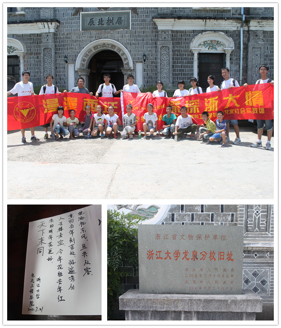 接着同学和老师们参观了浙大校史纪念馆。1939年,正是抗日烽火炎炎的岁月。当时,全国沿海各大学多已西迁,浙江大学本部也已经迁到了广西宜山。当时的浙大校长竺可桢考虑到东南各省青年学生因战乱所造成的困难而不能升学的很多,于是在1939年1月提出在浙东设立分校。经过反复的考察研究,最后确定校址设在龙泉芳野,并租用芳野曾家大屋作为校舍。教师胡伦清先生口诵了一副自撰的对联:“以弦以歌,往哲遗规追鹿洞;学书学剑,几生清福到龙泉。”这幅对联刻画出了浙大的“求是”学风教风以及浙大学子在艰难世事中的坚持。如今,它还贴在曾家大屋的中堂上。