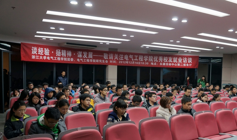 面对面交流,面对面碰撞,实现面对面分享。浙江大学电气工程学院“谈经验•扬精神•谋发展”——优秀校友就业访谈活动于2012年12月16日18:30在玉泉校区永谦活动中心第二报告厅拉开帷幕。三位昔日E电园里的佼佼者重返母校,与在座的每一位学子分享自己步入社会后宝贵的工作体验和人生感悟。他们以入职者的独到视角,对于在校大学生职业规划提出了中肯建议,用他们的热忱和激情诠释了电气工程学院传承不息的校友情谊。