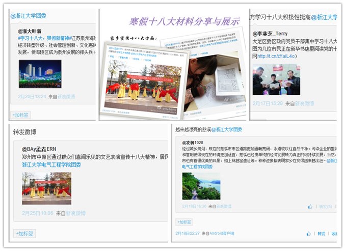 寒假期间,电气工程学院团委官方微博接收到了来自全国各地的微博通知。这些微博图文并茂的记述了团委骨干们家乡的相关情况,从中可以看到当地政府和民政部门对十八大重要会议精神的宣传力度,也看到当地民众对十八大会议精神高涨的学习热情。十八大的召开,正处在我国全面建设小康社会的关键时期和深化改革开放、加快转变经济发展方式的攻坚时期,同时也是在迅速发展后期间的一个节点,许多同学也在自己的微博里贴出了家乡迅速发展的对比图,在其微博内容的字里行间,流露着浓浓的乡情与自豪。