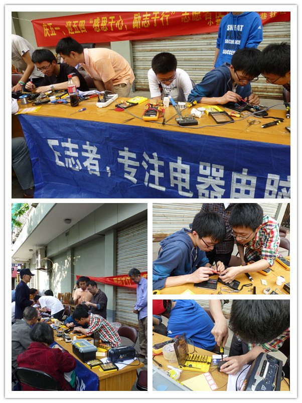 才刚刚开始半个小时,我们就收到了十来件电器,大多以收音机、录音机为主。其中还有一台笔记本电脑,本来是我们最拿手的项目了,但是经过叶昊阳的检查之后,发现是电脑进液导致了显卡受损,我们实在没有办法维修。不过,叶昊阳耐心地告诉居民接下来应该送到售后服务那里,更换一些零件即可。我们每个人都没闲着,两三个人为一组热闹地研究着。人事部的赵鑫源热情地接待着每一个上前询问的居民,记录好居民的电器故障和联系电话,再把坏掉的电器交给负责维修的同学。从玉泉校区赶来的陈峰学长和朱泽翔学长非常给力,对几个疑难的问题很有经验,便指导着我们继续修下去。