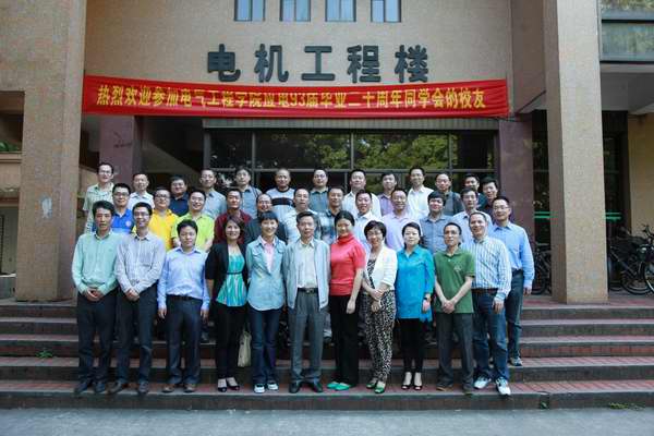 2013年5月11日,杭州久雨放晴,天湛蓝,柳叶嫩绿,人更显得分外精神。毕业离校20年后,应电89的38名学子从全国各地赶回母校玉泉校区,欢聚一堂,两位班主任中徐德鸿老师由于出差,抱憾未能相见,大家见到了思念已久的何湘宁老师,向何老师汇报了各自的工作和家庭情况,何老师也向同学们介绍了浙大的近况,我们的应电专业已经升格为电气工程学院应电系,专业更名为电子信息工程。电气学院实力超群,无论是科研成果,论文,经费等都在浙大甚至全国名列前茅,大家听了都为之骄傲,为之振奋。可喜的是,应电89的大部分同学在通信、电力等相关行业拼搏,各有建树,很多同学在业内已是赫赫有名,同学中出了11个博士和博士后。同学们的成功,得益于在母校打下的坚实基础,得益于浙大“求是”学风的熏陶,亲爱的母校,您永远在我们心中!