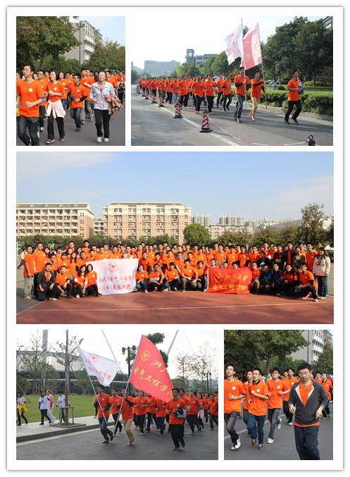 开幕式伊始,全体师生奏唱国歌,庄严肃穆;接下来奏唱校歌,“大不自多,海纳江河”的词句让人倍感亲切,歌声悠扬。而后由校长林建华致辞。林校长说道,参加体育锻炼不仅可以增强体质,更能磨练意志,培养团队意识,并表达了对广大师生走出室外、参与健身的热切期盼。林校长曾在新生始业教育时与大家约定一同健身长跑,增强师生体质,而开幕式中的重要一环——冬季阳光健身长跑启动仪式——正是履行这个约定的开始。在校运会运动员裁判员代表宣誓、长跑启动仪式学生代表发言后,校党委书记金德水宣布冬季阳光健身长跑正式启动。随后,各学院代表队接连从体育场出发,开始环紫金港长跑活动。电气工程学院代表队统一着装,橙色的上衣就像冬季的阳光一般耀眼温暖,学院党委副书记王玉芬老师、学院党委副书记刘翔老师和学院团委副书记潘伟老师也在队伍当中,与电气学子们一同列队行进。迎着早晨的阳光,伴着和煦的微风,踏着矫健的步伐,在电气工程学院旗帜的带动下,本科生、研究生、博士生的学生代表和老师们一起朝着心中的信念前进,在绿树环映的校道上,挥洒着运动的汗水。四千米的长跑在师生们精神抖擞的奔跑中很快就结束了,每个人都从中感受到了运动的快乐,而长跑代表队的昂扬士气也点燃了电气运动员们的斗志。