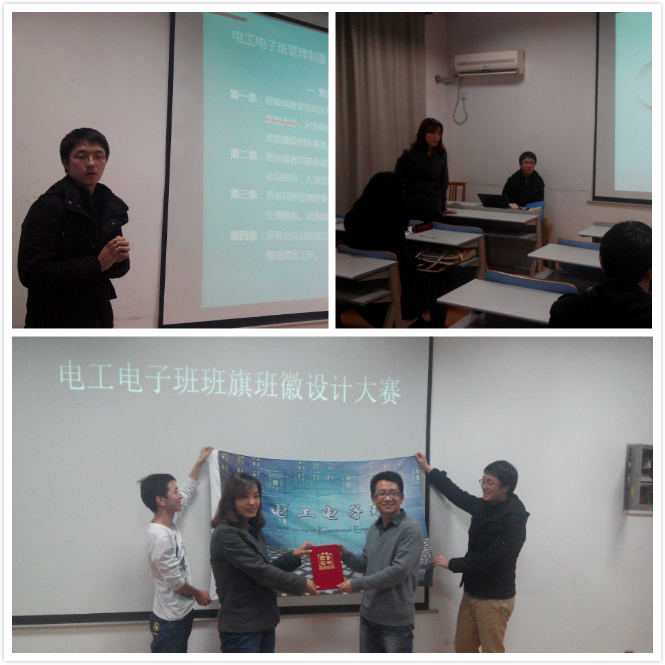 转眼秋学期已经结束,天气渐凉,电工电子班的同学们经过一学期的接触和相处,已经彼此熟悉。为响应电气工程学院团委关于开展2013年“基层团组织建设月”活动,也为了建设我们班级的特色,我们充分利用支部内外的资源,发挥我们灵活的交际能力和工作能力,电工电子班支部决定制作出属于我们自己班级的班徽,制定出属于我们自己班级的制度。