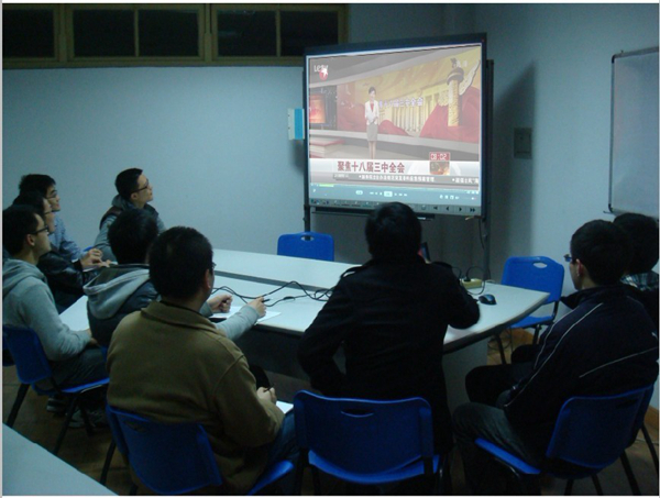 另一部分的活动于11月29日完举行。首先由电力系统博士生班团支部书记讲话,他与大家分享了党的十八届三中全会的精神,重点分析了“提高国有资本收入上缴”,“渐进式延迟退休年龄政策”,“逐步取消学校医院等单位行政级别”等方面的内容,并与大家积极交流讨论。然后是观摩学习十八届三中全会视频录像,在观看过程中,由电力系统博团支部宣传委员为大家解读党的十八届三中全会报告,他从各方面为我们详细阐述十八届三中全会的深刻内涵,给在场同学带来了很多思考。