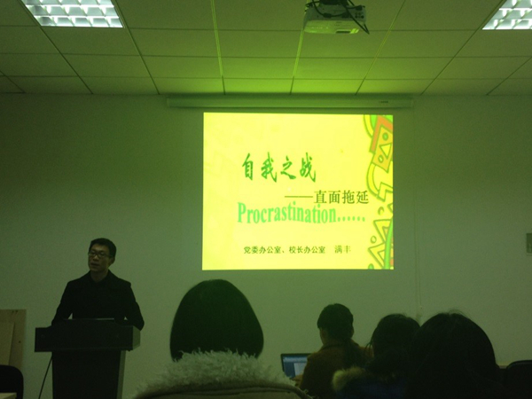 2013年12月2日晚18:30,由电气学院SQTP小组举办的“跑在时间之前——理性挑战拖延症”主题讲座在蓝田五舍111活动室顺利开展。我们邀请了原蓝田学园辅导员,现在校机关工作并在浙江大学心理辅导中心做心理咨询师的满丰老师作为讲座的主讲人,他给大家带来了发人深思的演讲。