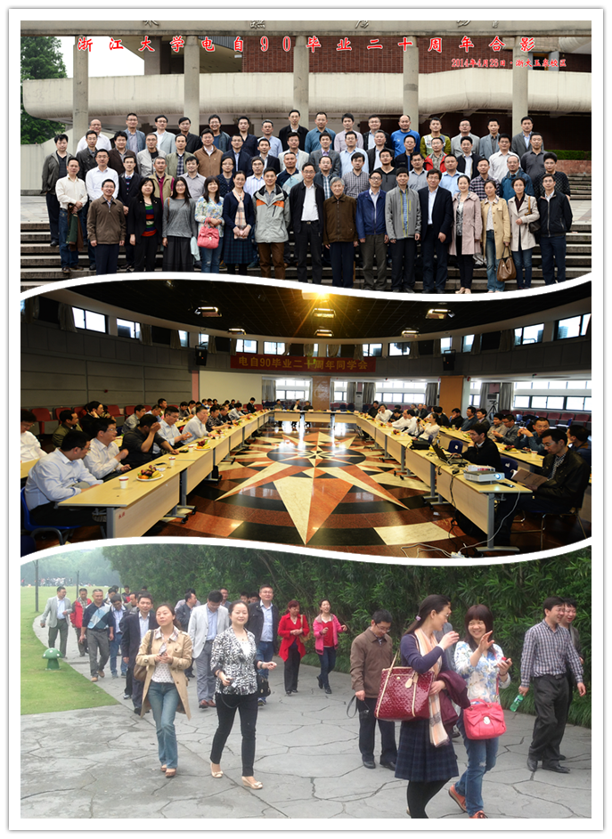 聚会为期三天,活动非常精彩。4月25日报到当天在酒店安排了欢迎自助餐晚宴。26日上午同学们参观了紫金港新校区,中午在浙大玉泉食堂重温了打菜吃饭的过程,然后重游了当年的宿舍和教学楼。下午同学们在永谦活动中心多功能厅举行了隆重的以追忆20年为主题的活动,会上黄民翔老师介绍了学院和电自专业这20年的发展历程,各位同学和班主任蔡新尧老师、葛邦显老师、徐习东老师介绍了各自的工作生活情况,追忆当年在学校的各种趣闻囧事。电机、应电和工自专业也派出了代表共同参加我们的活动。27日各位同学轻松愉悦地游览了西溪湿地。
