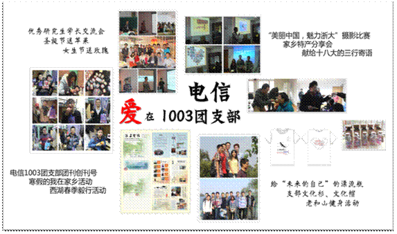 电信1003团支部成立于2011年11月,共有团员25人(含正式党员9人,预备党员1人,入党积极分子4人),支部十分注重组织、制度、阵地、文化等各方面的建设,两年多来,在支部成员的共同努力下,支部凝聚力不断加强,支部成员学习成绩和科研水平不断提高,并取得了包括“浙江大学十佳大学生”在内的众多荣誉。