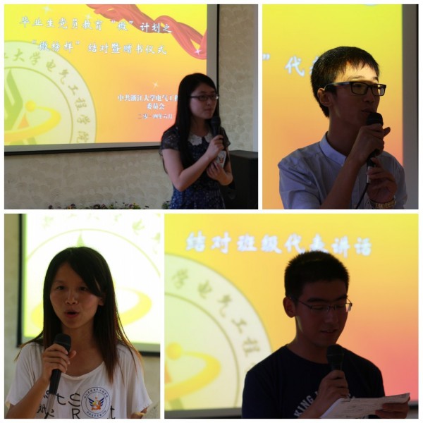 在赵老师简短的活动介绍之后,毕业生“微榜样”叶新学长上台讲话。叶学长对12级同学如何学习,强化自己的能力提出自己的建议。他认为最重要的一点是低年级同学应该抓住机遇,多与“微榜样”交流,借助高年级学长学姐的经验可以少走弯路。随后竺可桢奖学金获得者徐碧莹学姐向大家分享经验心得。她以自己在大学四年学习过程中总结出来的经验告诫同学们要把握时间,朝着目标不断前进。接下来由结对班级代表电气工程及其自动化1203班班长田乐发表感想。田乐同学对学院提供这样的交流平台,为他们的成长助力表示感谢。他同时也表示,了解了优秀学长学姐的成就,对将来的学习道路充满了信心和憧憬,希望在未来能不断前进,达成自己的目标。