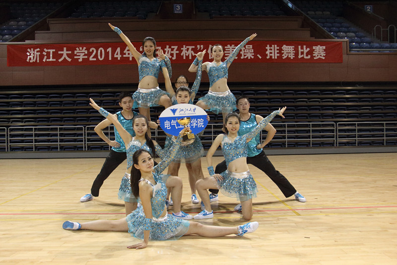 为推动学校群众性体育活动的开展,丰富校园体育文化生活,10月18日下午,由浙江大学公共体育与艺术部主办的浙江大学2014年“三好杯”健美操、排舞比赛在浙江大学紫金港体育馆举行。电气学院由7位女生和2位男生组成的健美操队伍参加比赛。