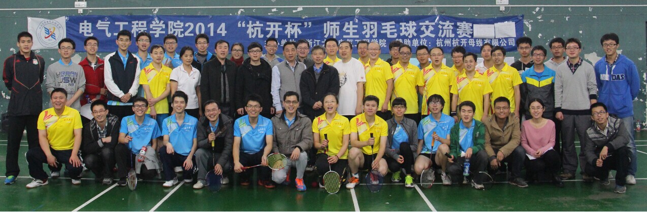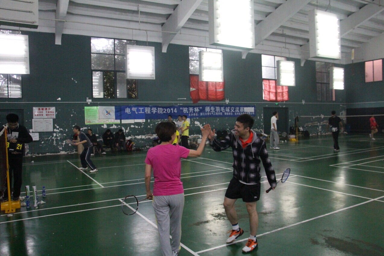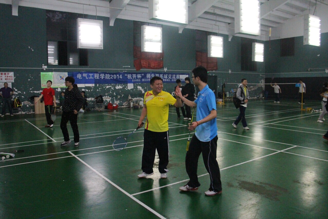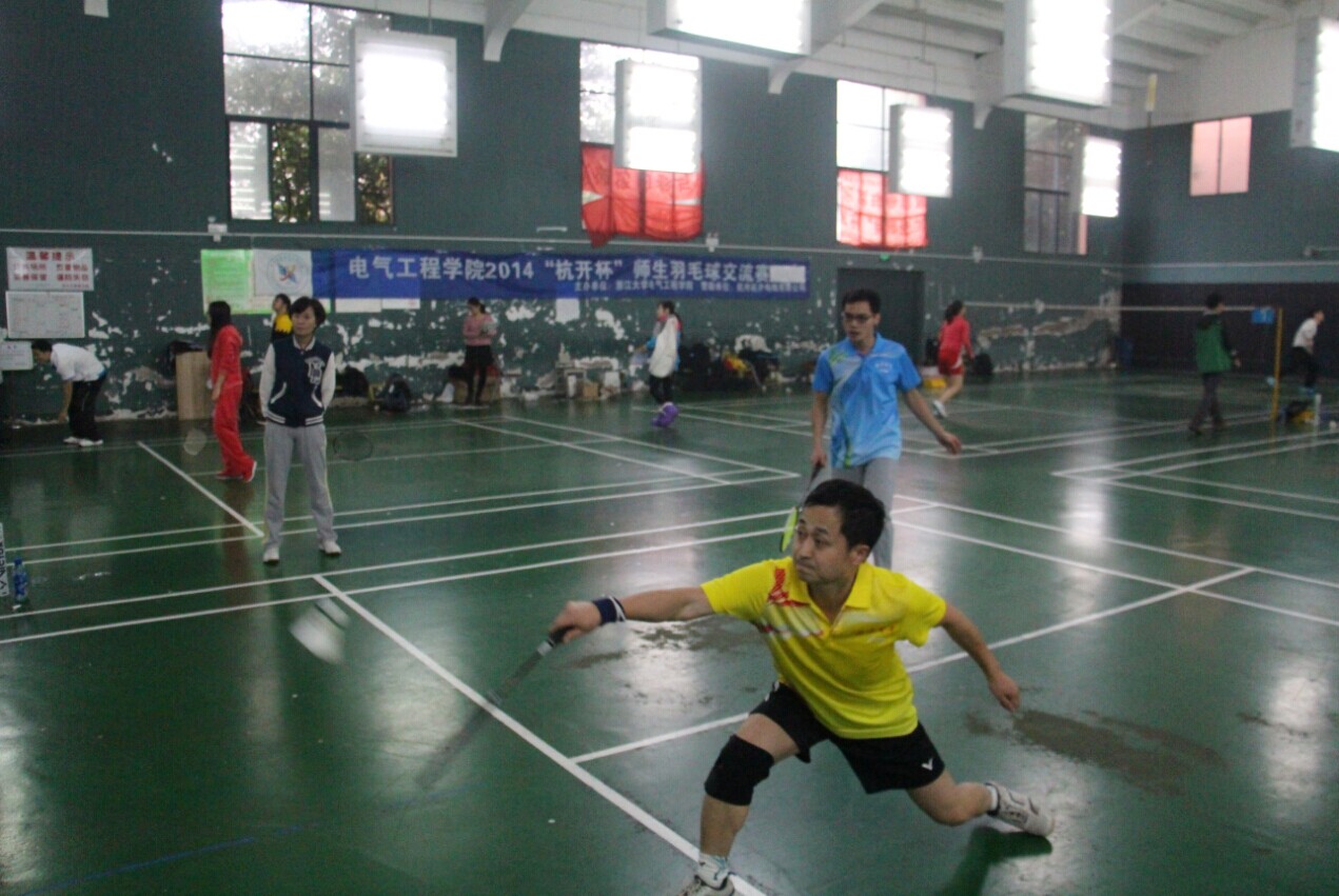2014年11月29日下午,大家期待已久的电气工程学院2014“杭开杯”师生羽毛球赛在玉泉羽毛球馆如期举行。下午13:00不到,参加比赛的队员们已经提前到场进行热身,阵阵清脆的击球声仿佛预示着今天的比赛将是一场一场“活力与沉稳的交汇,智慧和耐力的较量”!