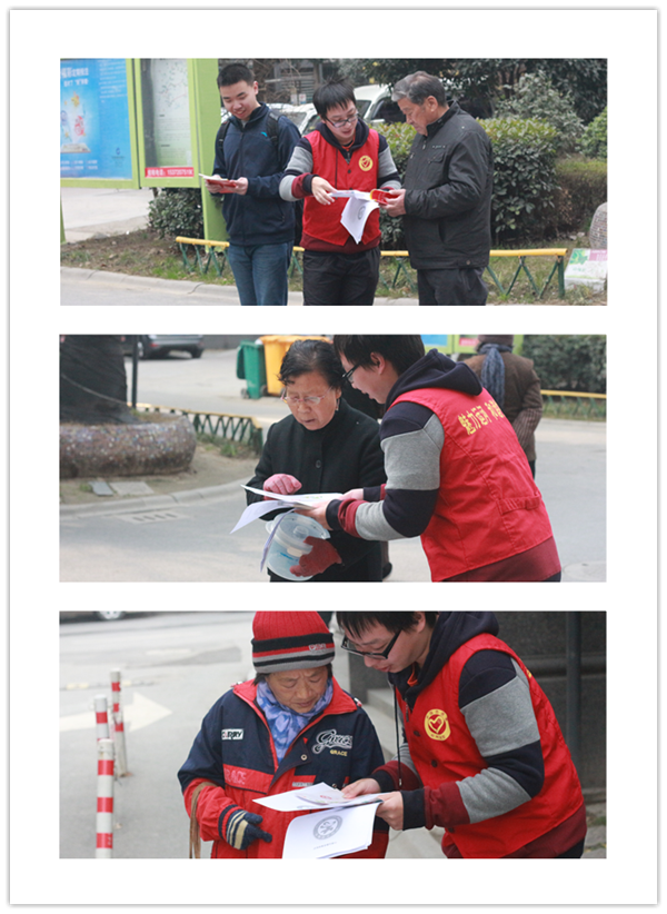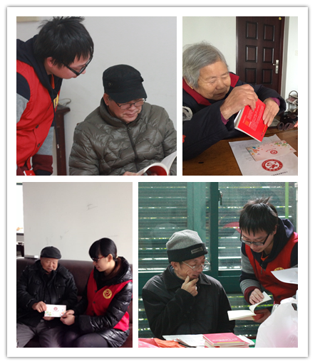 本次志愿活动分为三部分:慰问孤寡老人、社区卫生服务、中国志愿服务标识推广与普法宣传。其中,中国志愿服务标识推广与普法宣传是本次活动的重点内容,并贯穿在孤寡老人访问的活动中。2014年12月27日清晨,乘坐1个多小时的公车,电气工程学院的青年志愿者们到达了拱墅区北星社区。根据前一日动员会的安排,志愿者们分为三组,分别前往各自的服务地点并开展志愿服务工作。