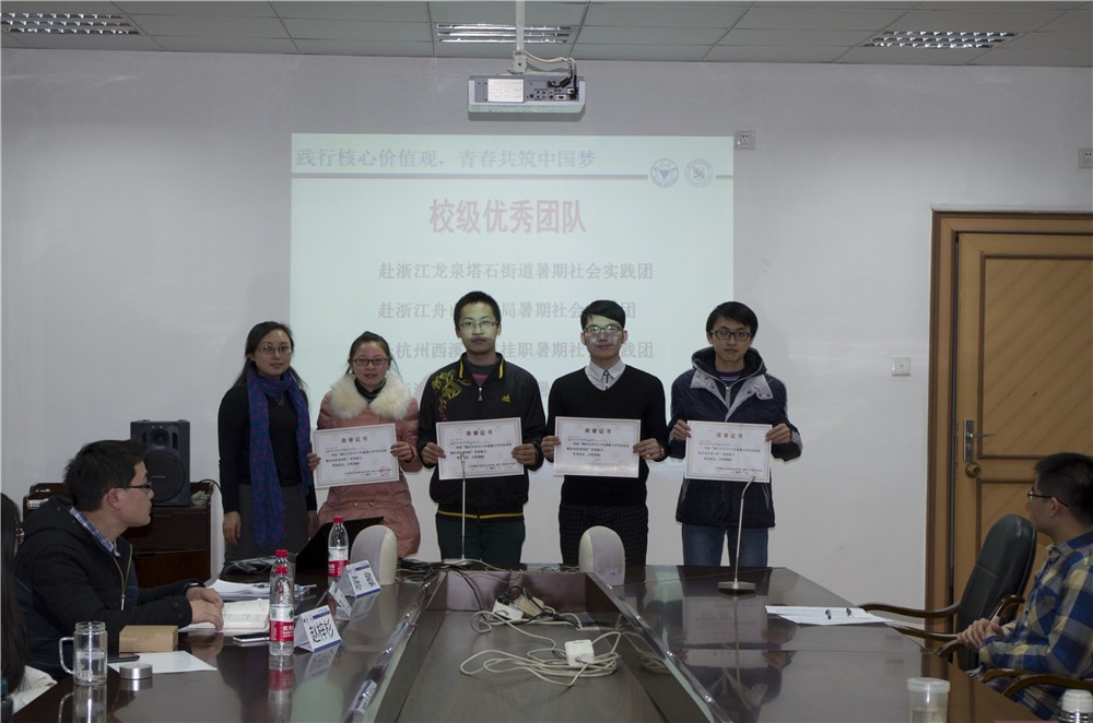 在完成颁奖环节之后,主持人带领大家进入到了优秀团队的实践分享环节,这其中有赴浙江龙泉塔石街道暑期社会实践团以“基础教育龙泉行,青春共筑中国梦”为主旨,以“春泥课堂”为主线,开展的一系列主题社会实践活动;有赴西溪街道暑期社会实践团,以“满怀求是赤子心 共建社区亲子情”为主旨在社区开展的丰富多样的活动;也有赴浙江舟山电力局的以“海洋电力发展”为主题的交流与调研活动等等。通过这些优秀团队的实践分享,同学们收获了不少的经验,也对如何更好的做好社会实践有了更新的认识。