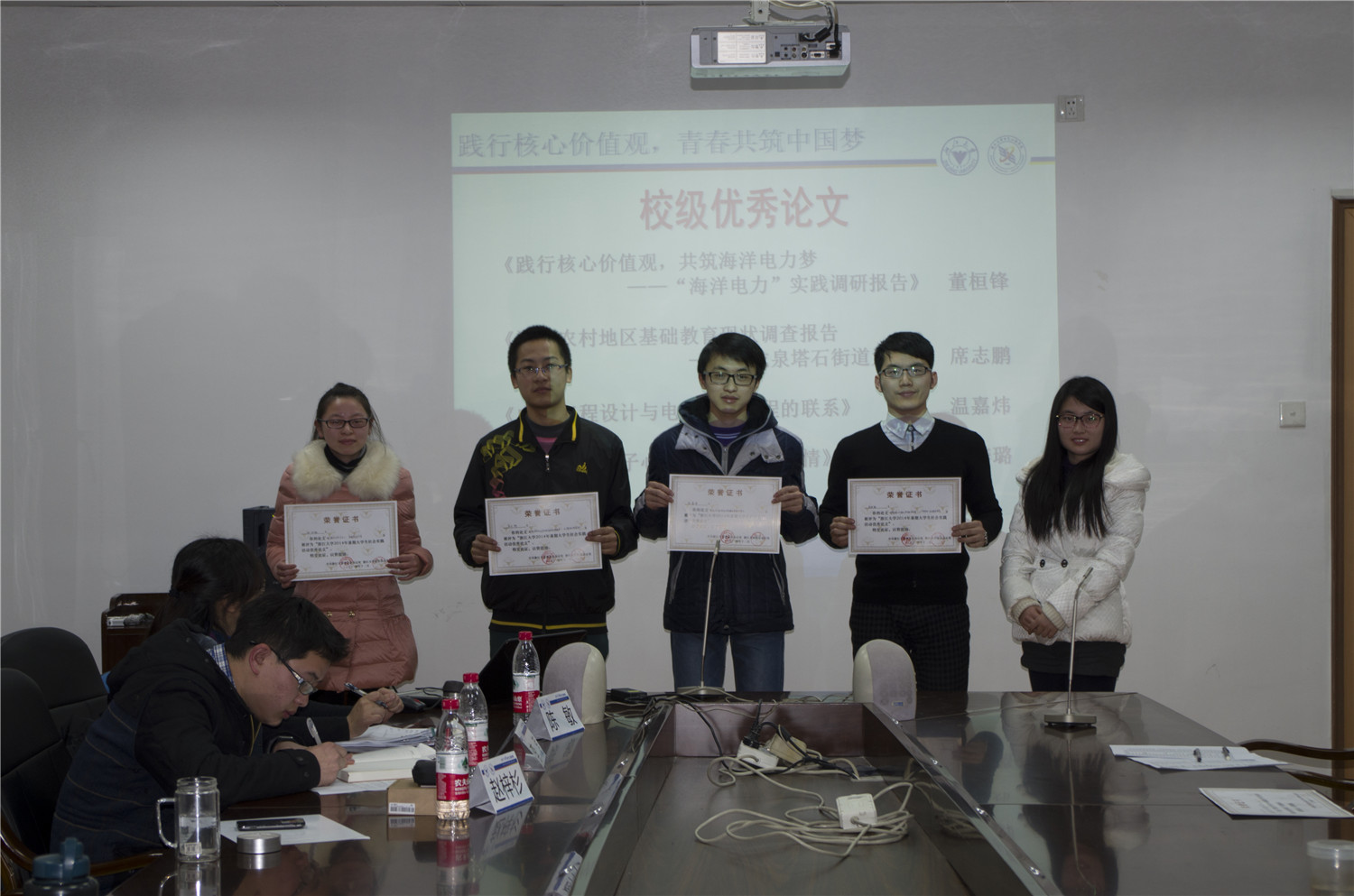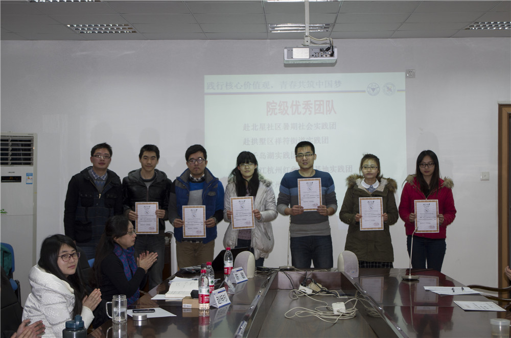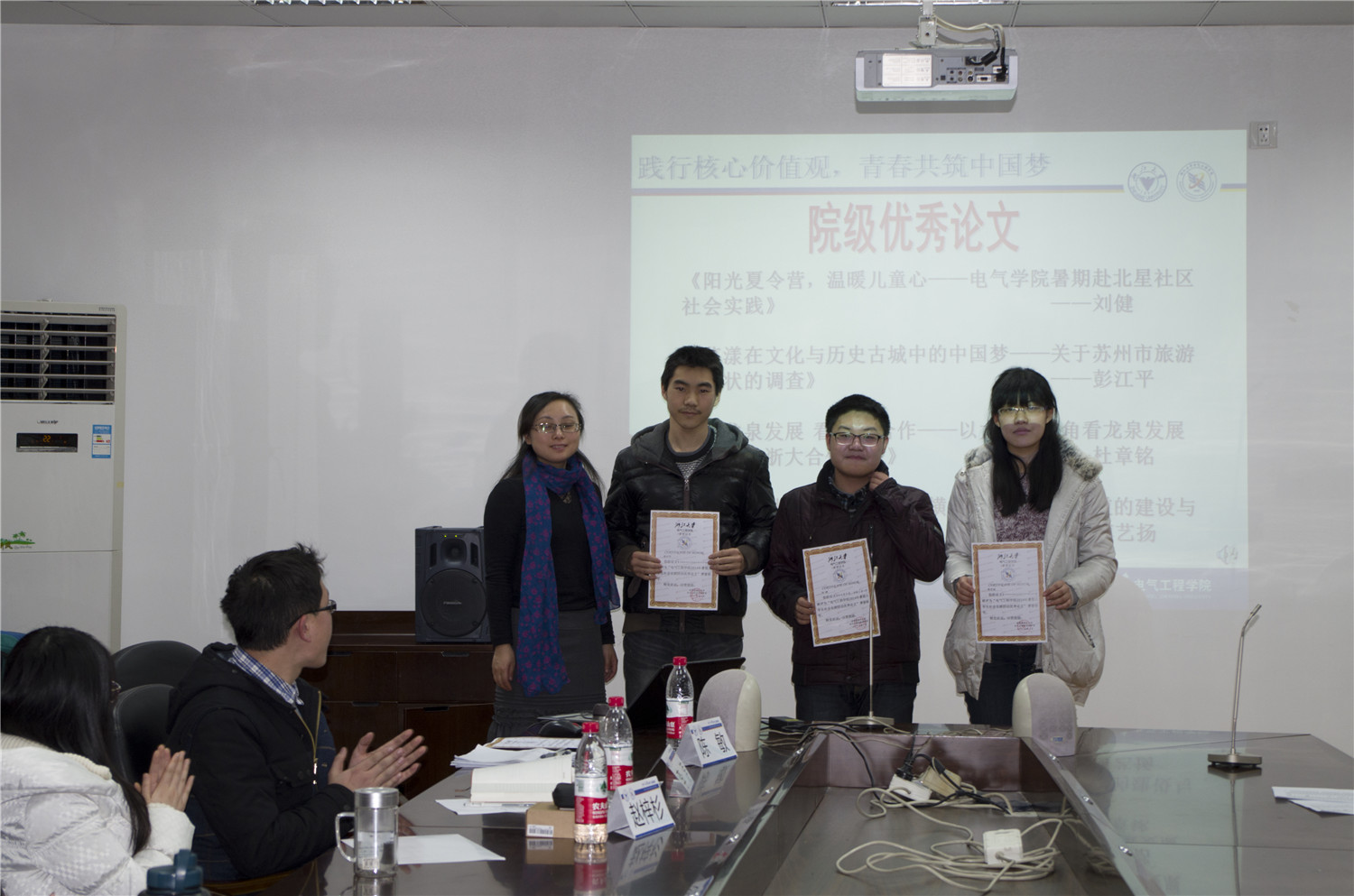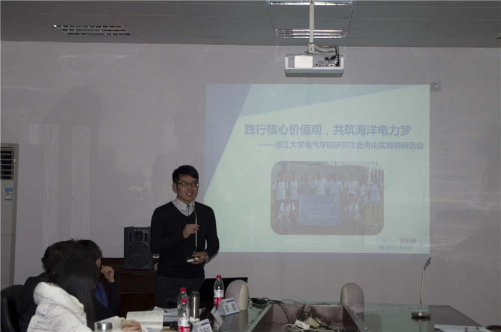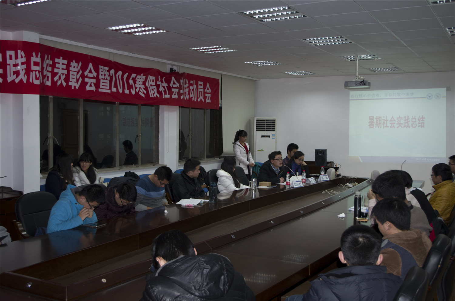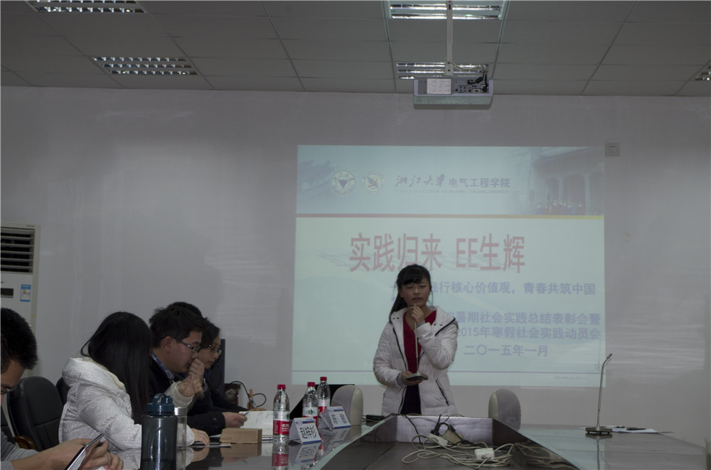 1月8日晚6:30,电气工程学院2014年暑期社会实践表彰大会暨2015年寒假社会实践动员大会在电机工程楼201隆重举行,团委社会实践部部长韩畅担任主持人,电气学院团委书记陈敏老师,团委副书记李涛老师和赵梓杉老师以及获奖团队和先进个人出席本次会议。学期初完成班团组建工作的13级学院各专业班团支书也从紫金港校区赶来,听取获奖团队分享经验。