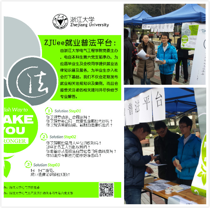 支部成员注意到近年来社交“微信”在学生群体中的普及程度,为了更好地方便同学,以及提升他们的参与积极性,创建了微信服务类公众平台——“ZJUee就业普法平台”(后简称普法平台),并在普法平台中定期推送就业相关法律知识和案例。12月19号中午,支部的全体成员在永谦剧场门口进行了现场宣传。现场宣传采用了发放传单的方式推广普法平台,另外支部成员还制作了精美的海报和易拉宝,方便同学们现场“扫一扫”关注普法平台,对于在现场关注的同学,支部还赠送一本最新修正版的“中华人民共和国劳动合同法”作为礼品。当天的现场非常火爆,奖品和传单供不应求,有部分同学对于平台信息来源的可靠性提出疑问,我们都一一进行了解答,也有同学们对支部的活动给予了鼓励,表示会持续关注平台并给以反馈。据统计,现场共发出400张传单以及50本劳动法,而当天小计有58人关注普法平台。