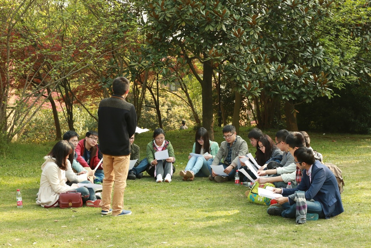 4月11日上午十点,超大所的同学们在超大所楼下集合,在党支书赵辛宇同学的带领下紧张有序地乘车前往之江校区。浙江大学之江校区坐落在钱塘江畔、六和塔边的月轮山峦。环境清幽、景色怡人,法学院也正是坐落此处。到达之江校区大概是中午十一点半,同学们简单吃过午饭后,便坐在主楼前的草坪上展开讨论。
