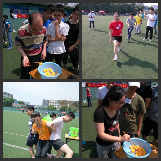 本届趣味运动会的项目包括跳大绳、绑腿赛跑、四人背筐跑、筷子夹乒乓球、飞包入筐、袋鼠跳等趣味性极强、需要师生共同参与的集体项目,全院共计二十支队伍参加比赛。“跳大绳”要求十名队员全员参加,其中至少有两名女生、一名老师,这不仅能保证师生的参与度,增进师生间交流,同时也是对团队协作能力的考验,但这丝毫不影响同学们的热情,最终大都取得了不错的成绩;八人制的“绑腿赛跑”对团队的配合及默契度考验极大,任何一名队员稍有不慎都可能造成整队人员摔倒;“四人背筐跑”需两名男生两名女生参加,不仅考验速度,同时也考验团队协作,四人步调一致方能顺利达到终点;最需要耐心与细心的当属“筷子夹乒乓球”,不仅手上筷功了得,脚下还得健步如飞;最激烈的“飞包入筐”总能引得阵阵呐喊,投射、接包,每位队员发挥所长,谁也不闲着;“袋鼠跳”看似轻松,实则对个人的灵活性和协调性要求极高,而两队同时进行比赛也给该项目增添了不少竞技元素,各队队员此起彼伏的加油声与场地上队员们蹦蹦跳跳略显滑稽的跳姿,把整个运动会的气氛推向了高潮。比赛告一段落后更有精彩纷呈的互动答题环节,获胜的同学皆获得了精美的小礼品。