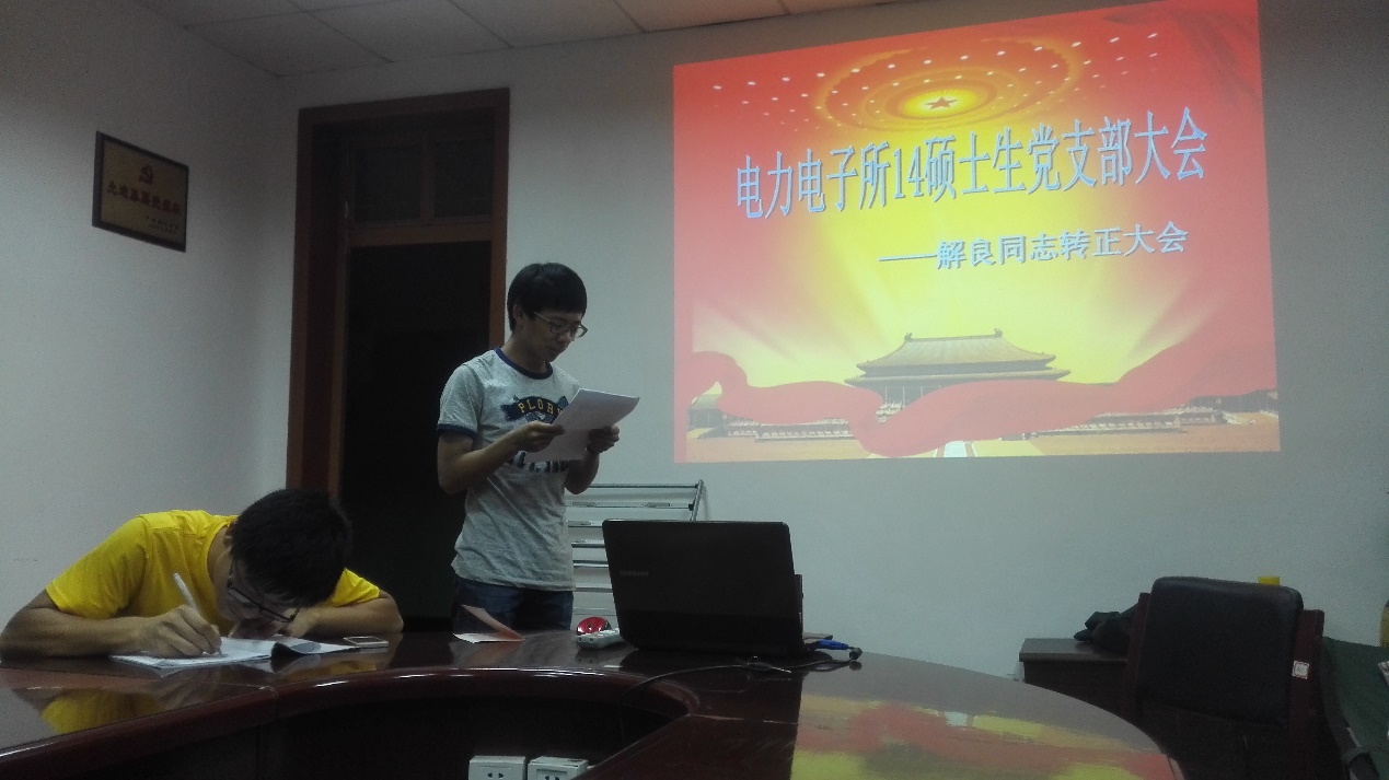 6月23日晚,电力电子所2014级硕士生党支部在教二422召开预备党员转正大会。电力电子所2014级硕士生党支部全体党员参加此次会议,会议由党支部书记兰桂星同志主持召开,讨论并通过解良同志由预备党员转为正式党员。