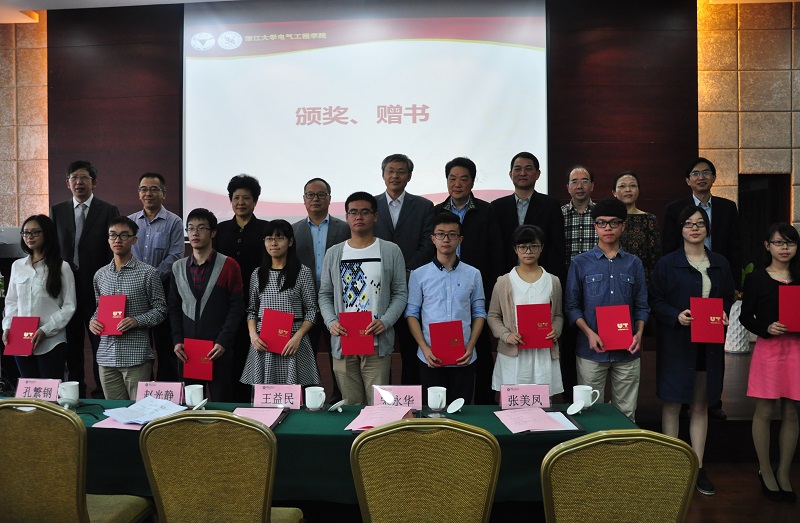 浙江大学电气工程学院共有10位本科生获2015年度“特高压电网奖学金”,国网公司领导与学校领导共同为同学们颁发了获奖证书,且赠予获奖同学以《全球能源互联网》和《特高压交直流电网》两本专业著作。程雨诗代表获奖全体学生向特高压奖学基金会表示由衷感谢,并表示国家电网努力超越、追求卓越的价值理念将不断激励电力学子求是创新,超越自我,承担社会责任,积极投身到电力事业中,为祖国的现代化建设做出贡献。