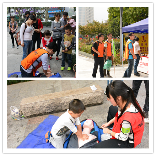 接着同学们来到了古武林门,在这里要完成的任务是向路人教学心肺复苏术。同学们首先跟教练学习了心肺复苏的主要步骤:判断意识、胸外按压、人工呼吸,同学们先跟随教练的指导在假人上进行了实际操作,确认掌握熟练后教给路人。同学们的教学演示吸引了许多的围观群众,一开始有些路人还比较害羞不愿上前尝试,但在同学们的号召下都上前实践心肺复苏术。完成10名路人的教学后,同学们得到了午餐基金和下一关线索。