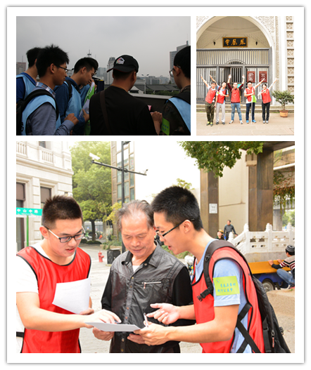 下一关同学们来到了西湖涌金广场,这一关的任务是邀请20位路人填写公益调查问卷并合影留证。同学们立即在组内展开了分工,有人负责邀请路人填写问卷,有人负责拍照,有人负责记录问卷的总数,以提高效率。通过这一个小活动调查了人们对于公益的看法,同时也普及了公益常识,一举两得。完成20份问卷后,获得下一关的线索。