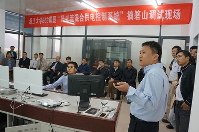 参加验收会议的领导和专家先期赴项目示范地点舟山摘箬山岛,现场考察了风光流混合供电系统示范工程。该系统装机容量目前在国内同类海岛系统中最大,总容量达3.5MW,其中海流能发电150kW,风力发电1.7MW,光伏发电320kW,储能最大可输出功率1.25MW;该系统运行灵活,研发了完全自主知识产权的、拥有多项世界先进技术的海岛电网自动发电控制及发电装备技术,保障供电系统能在3种不同的模式(最大功率输出模式、可调度模式、孤岛运行模式)下运行和灵活、无缝切换,成功解决了海岛微型电网“电网小、波动大”的难题,使得我国海洋背景清洁能源开发利用上上了一个新台阶。项目组成员辛焕海教授现场演示了考虑恶劣天气和灵活并网需求的海岛电网运行功能,全面展示了电气学院承担的课题在海岛电力装备、电网通讯系统、海岛电网控制系统研究与开发方面所取得的成果。