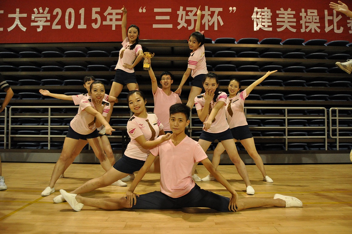 为推动学校群众性体育活动的开展,丰富校园体育文化生活,2015年10月26日-10月30日晚上,由浙江大学公共体育与艺术部主办的浙江大学2015年“三好杯”健美操、啦啦操比赛在浙江大学紫金港体育馆举行。电气工程学院由7位女生和2位男生组成的健美操队参加了健美操比赛。