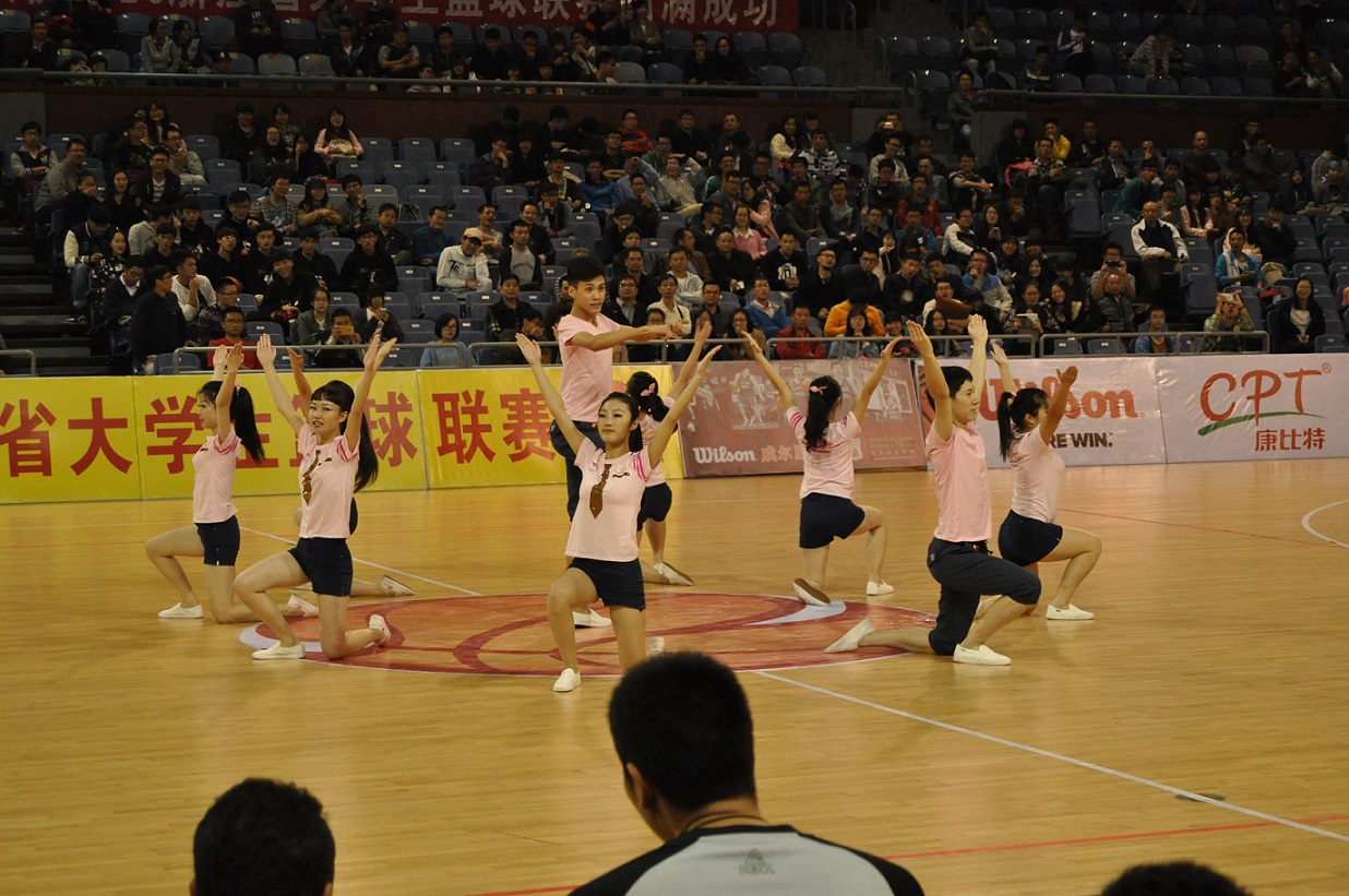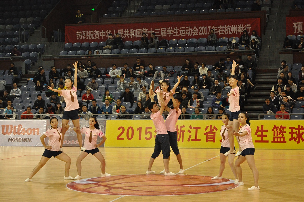 10月26日晚预赛正式开始前,队员们抓紧时间进行最后的排练,大家都显得紧张而跃跃欲试,候场时队员们相互提醒着需要注意的动作细节,并鼓励着彼此。比赛正式开始后,整支队伍以沉稳挺拔的姿态亮相,摆好造型后伴奏响起,队员们随着节奏感极强的鼓点开始了整齐有力的动作,大家全神贯注,脸上都洋溢着青春的笑容。我们共编排了36个八拍的动作,有2次托举造型与10次队形变化,精心设计的动作打动了评委老师们,获得了17.3分的成绩,顺利晋级决赛。晋级决赛后,大家总结和讨论了之前表演中的不足,继续加紧训练,反复练习基础动作。10月29日晚的决赛中,队员们以高昂饱满的热情再次出战,最终获得17.5的高分,取得了第三名的好成绩。此外,健美操队还应邀参加了10月30日晚浙江省大学生篮球联赛决赛的表演环节。