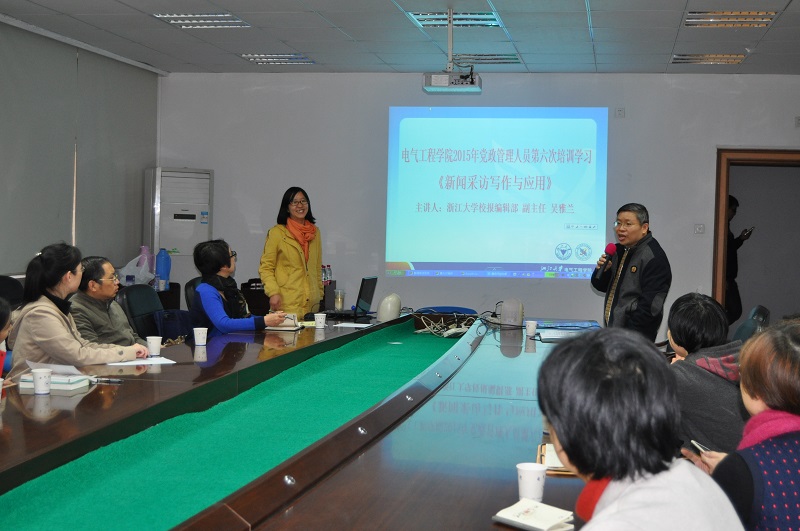 11月13日下午,电气学院于玉泉校区电机工程楼201举办了党政管理人员第六次培训学习,主题是“新闻采访写作与应用”。邀请了浙江大学校报编辑部副主任吴雅兰老师主讲,电气学院机关工作人员及各党支部宣传员参加了培训。