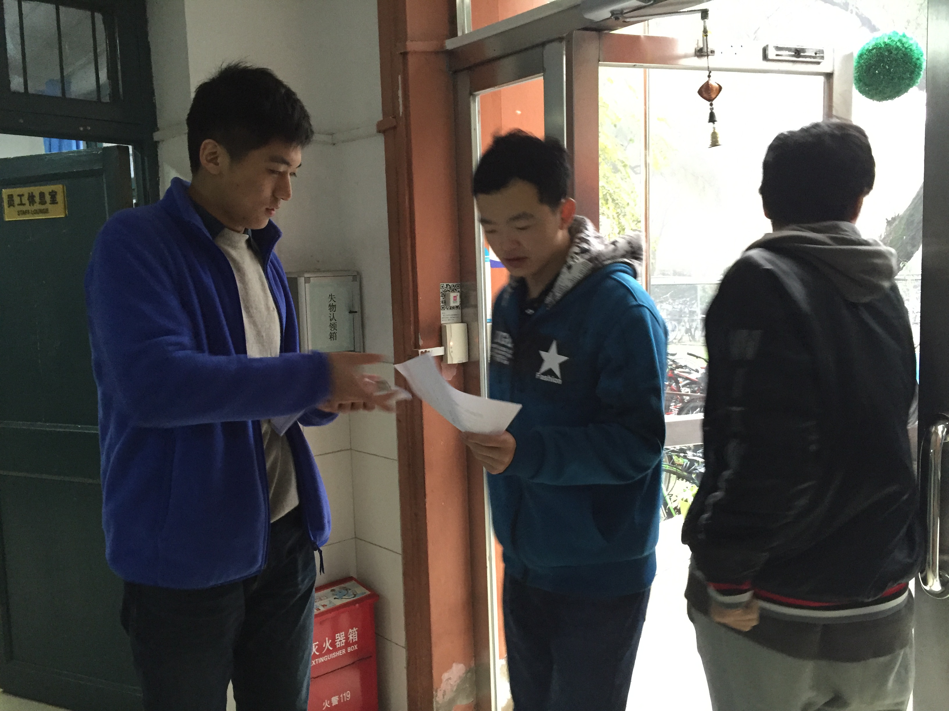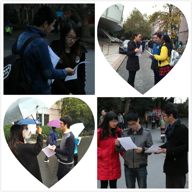 为了让这次活动尽可能多地覆盖玉泉校区的同学们,工作人员通过悬挂横幅以及线上(CC98论坛、各学院微信平台、QQ空间等)募捐信息发布、各班级团支部短信群发、寝室楼道传单张贴等形式进行活动的初步宣传。11月22日,活动志愿者在人流量密集的时间段于学生公寓楼下发放传单,并向来往的同学介绍冬衣募捐活动。