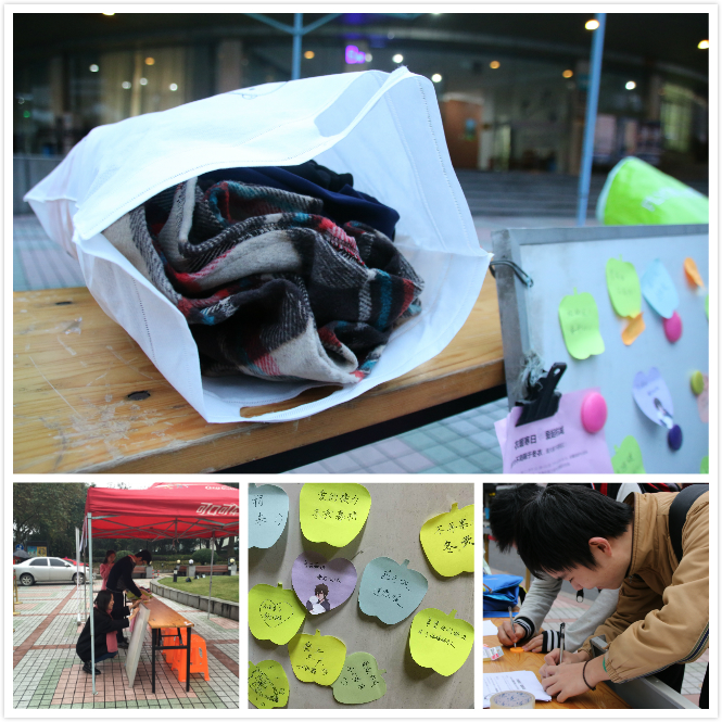 为了让更多人知道这个活动并且能够积极参与其中,11月24、25日,志愿者们顶着严寒,风雨无阻地在永谦学生活动中心广场摆摊现场宣传,得到了积极的响应,有同学拿着一大袋的衣物来到现场捐献,过往的同学也纷纷写下了对远方人们的温暖祝福。