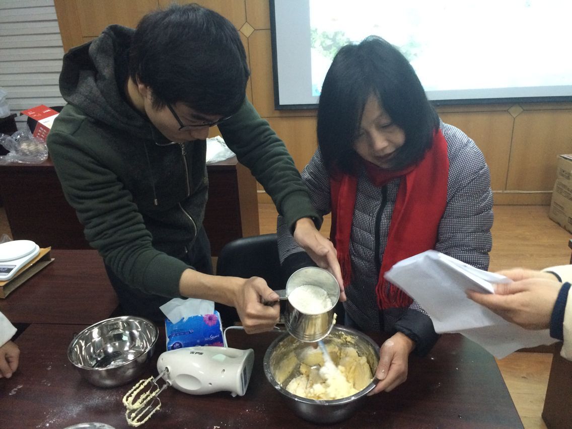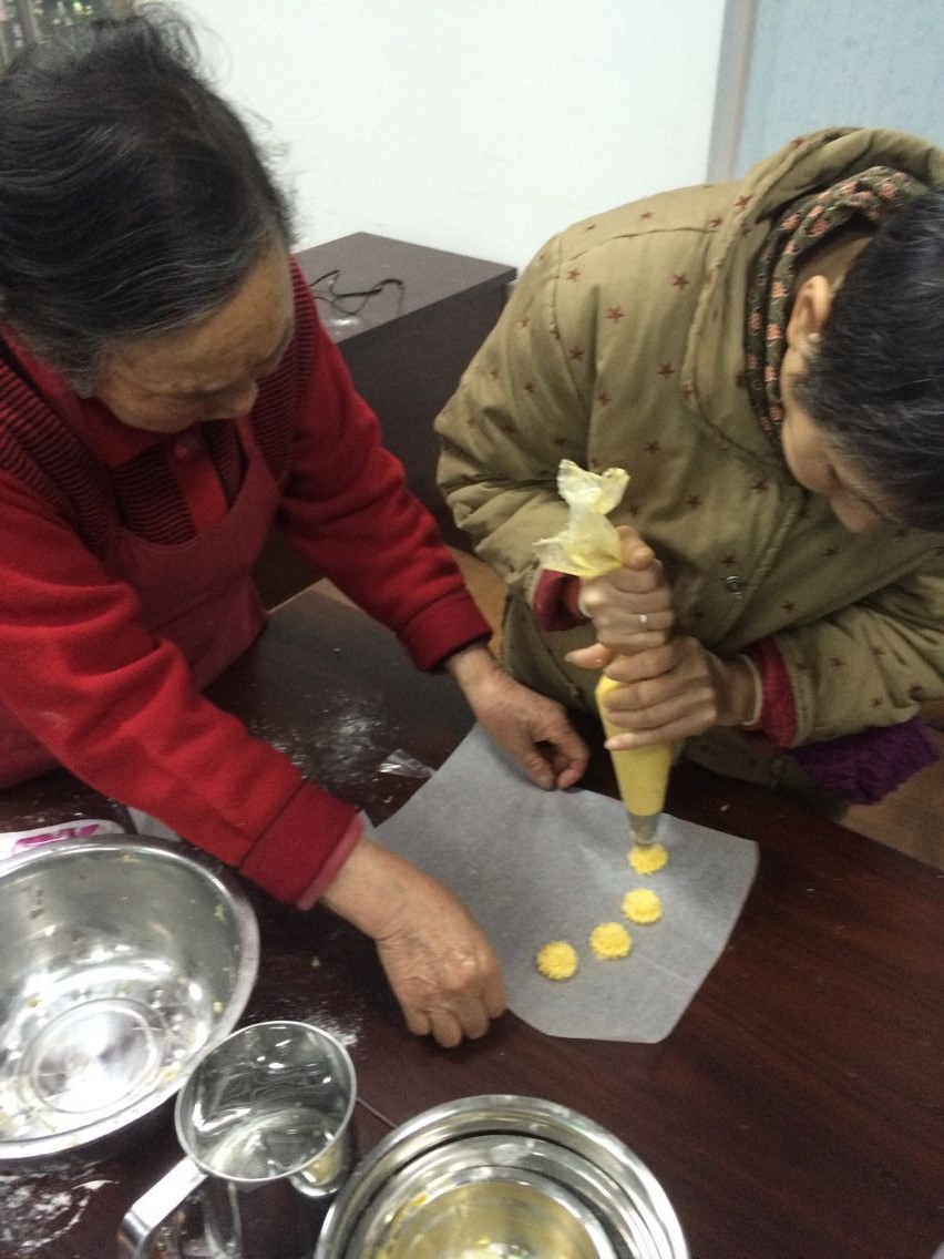 整个活动氛围都轻松愉快,在爷爷奶奶还没有到来的时候,志愿者们切黄油、打鸡蛋、称面粉,大部分也都是第一次做曲奇饼干,像一群求知若渴的学生。等爷爷奶奶们陆续到来后,将他们分组,每组会有志愿者负责协助。第一步将糖粉倒进黄油中搅拌,第二步将鸡蛋分三到四次加入搅拌,第三步将面粉用面粉筛筛过加入并搅拌,第四步将面团放在三角塑料袋中,这时创意大赛开始。爷爷奶奶们都发挥了自己的相信做出各种形状的曲奇。