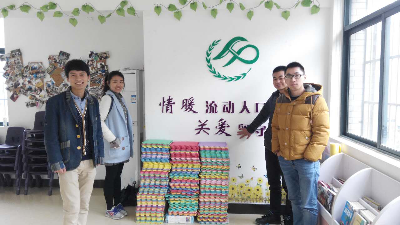2015年12月20日,这一期的党支部义工活动,选取了“情暖流动人口,关爱留守儿童”的青少年之家作为服务对象。这个工作站位于西湖区古荡街道荷花苑,这里的外来务工人员达1万多人,有1千多名外来务工者子女。进城务工的流动人口为杭州的建设添砖加瓦,然而他们的孩子却没有机会像城市小孩一样去各种兴趣班学习,他们大多只能在社区外面玩耍。于是为了给这些孩子建立一个相对安全的公共空间,青少年之家在社区建立了一个“青少年宫”,开设了周末兴趣课程。每个周末为孩子提供各种兴趣课程,内容包括书法、音乐、手工等兴趣爱好,也会陪孩子们玩耍,丰富他们的周末生活。