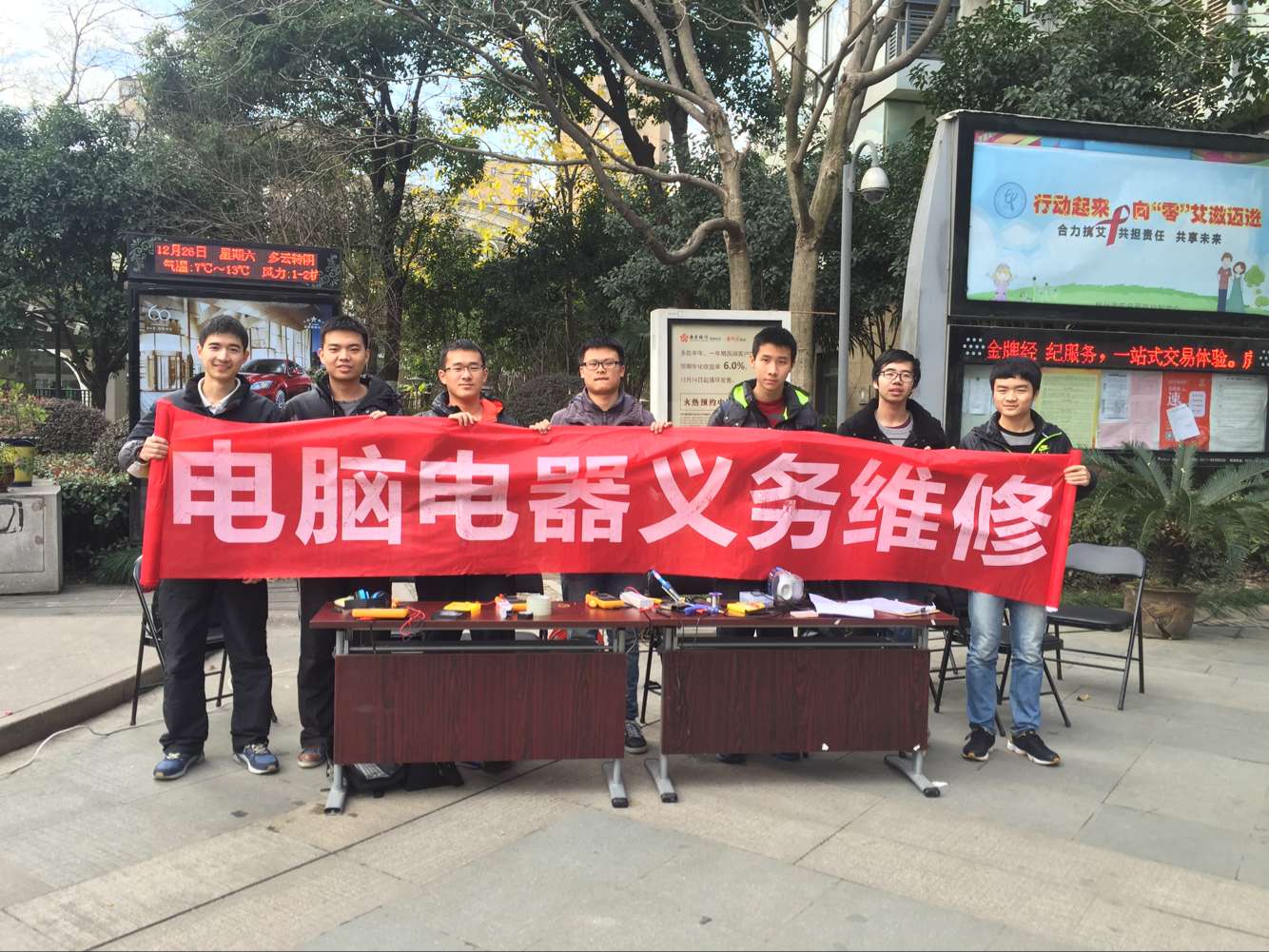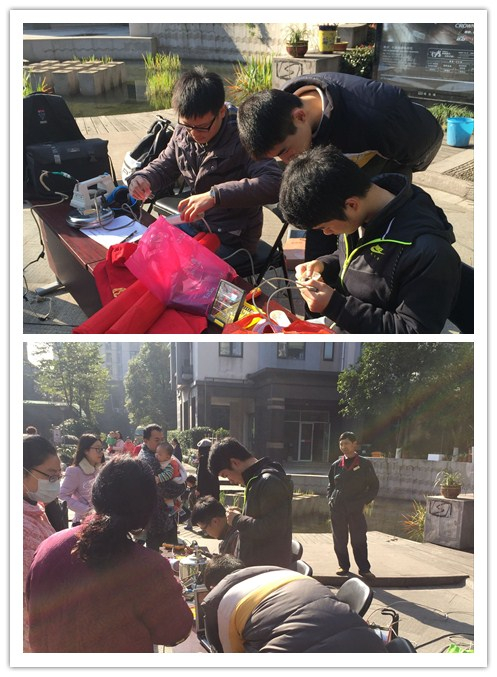 两个小分队先后到达了本次活动的目的地:杭州市拱墅区北星社区居委会。在社区负责人的引导下,电器维修分队的志愿者们首先来到了闲庭信步小区,在小区进门处摆起了电器维修摊位。免费电器维修很快引来了社区居民的围观,不少居民送来了电热水壶、电吹风、收音机等小电器,也有一些居民将笔记本电脑等大件带到了现场。志愿者先按照顺序记录了送修人的信息及保修物的信息,随即开始了紧张的维修工作。志愿者们细心排查可能的故障原因,并对症下药进行修理。当居民们拿到被修复完好的电器之后,纷纷真诚地向志愿者们表示感谢;部分电器由于损坏严重,已难以修复,志愿者们向居民说明了情况,这些居民也表示了理解和支持。随着一件件电器的修理完成,也有越来越多的居民送来了自己家中的故障电器,为了能够更好地服务居民,原定11点30结束的电器维修一直到12点30才结束。虽然工作辛苦,但志愿者们都为能够帮助居民解决困难而感到由衷地喜悦。