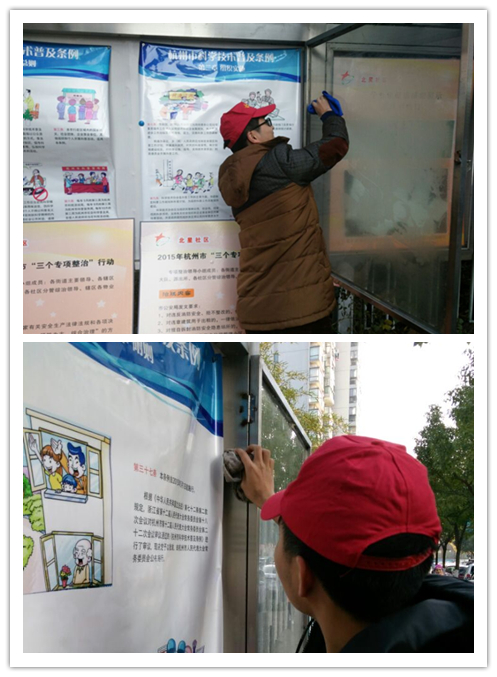 还有两名志愿者走上街头,帮助社区完成宣传栏清洁的工作。基础服务虽然比较繁琐也比较辛苦,但志愿者们都用心地完成每一项工作,为社区清洁贡献自己的力量。志愿者们的工作也得到了社区负责人的肯定与鼓励。在基础服务工作完成之后,志愿者们也来到了电器摆摊维修的现场,帮助电器维修分队的志愿者进行维持秩序、居民联系等工作。