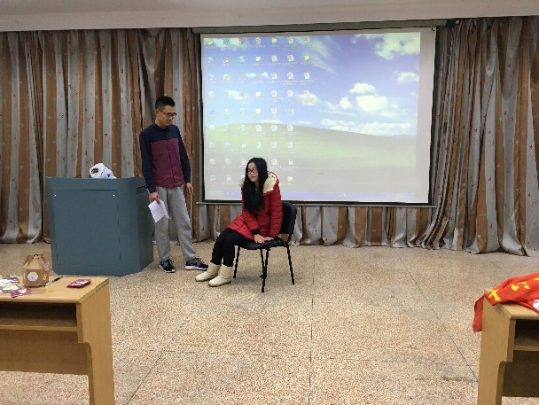 林楠、汪琦组选择了自编短话剧。话剧主体为宫廷看戏,折子戏《扶人》描述了一个撞人者逃逸,扶人者被讹的社会。当权者与众妃子关于扶人问题的看法矛盾构成了话剧主要冲突。借由冲突的产生引出了什么才是爱国、敬业、诚信、友善的正确看法,最终当权者制定了逃逸者重罚,扶人者嘉奖的政策。这也表现了支部同学对于扶人者的认可。话剧形式搞怪但含义深刻,博得了同学们的掌声和好评。