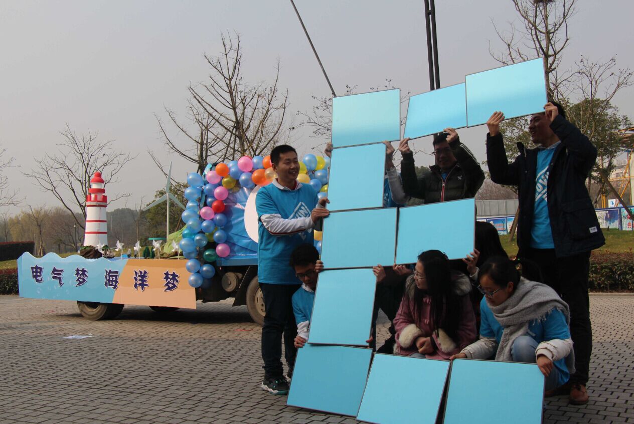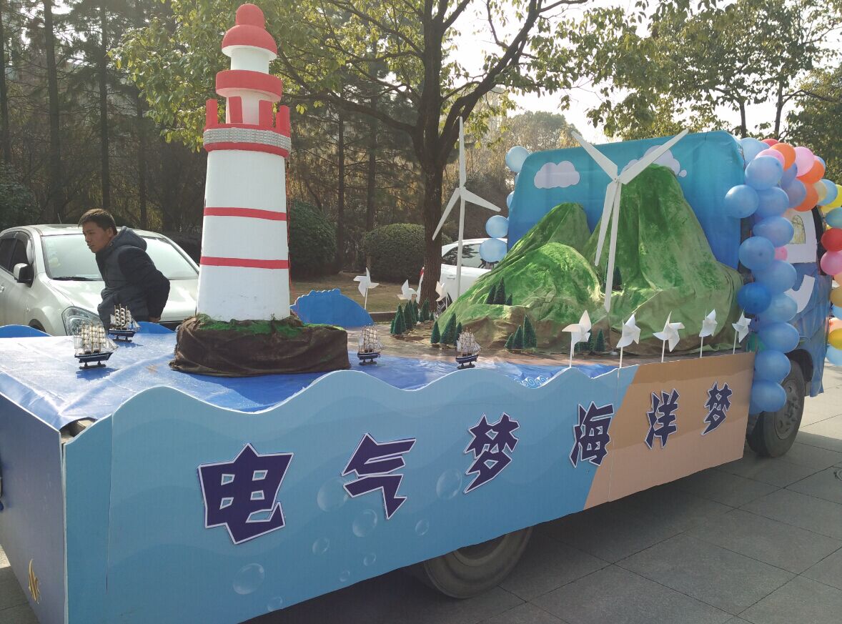 作为浙江大学的老牌专业,今年电气学院的巡游方阵以“电气梦”为主体,以“海洋”为支点,向浙大师生们展示了一幅海畔风力、水力发电,并以此点亮岛屿上寓意“电气梦”的高耸灯塔的美丽图景。上午10点,以“电气梦,海洋梦”主题的彩车到达体育馆外的指定位置,在老师与负责同学的组织下,同学们开始了巡游前的最后一次排练。