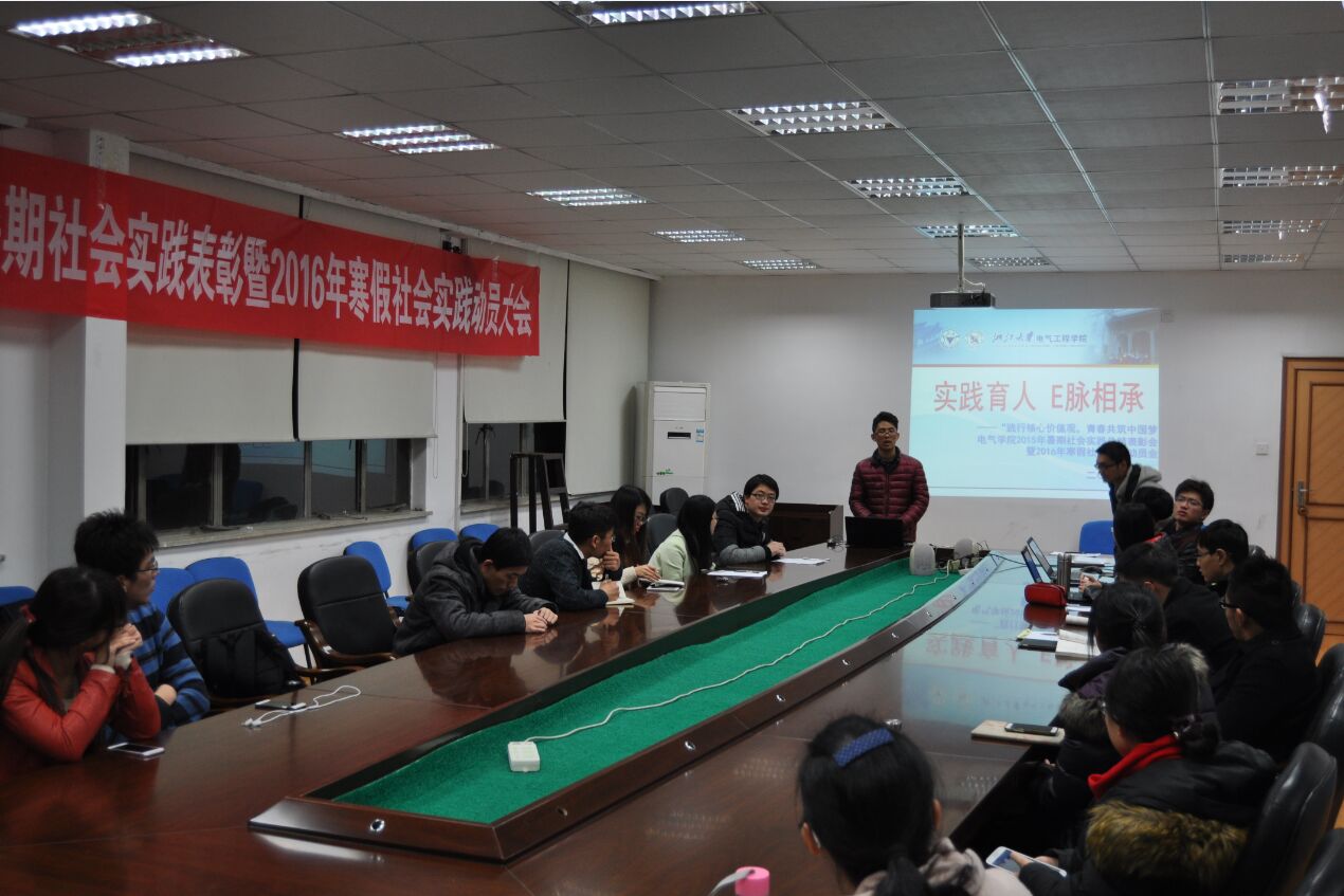 1月5号晚,电气工程学院2015年暑期社会实践表彰暨2016年寒假社会实践动员大会在电机工程楼201隆重举行。学院团委副书记李涛老师和赵梓杉老师、获奖团队代表和先进个人以及12级和13级的团支书出席了本次会议,会议由学院团委社会实践部部长郑壮主持。