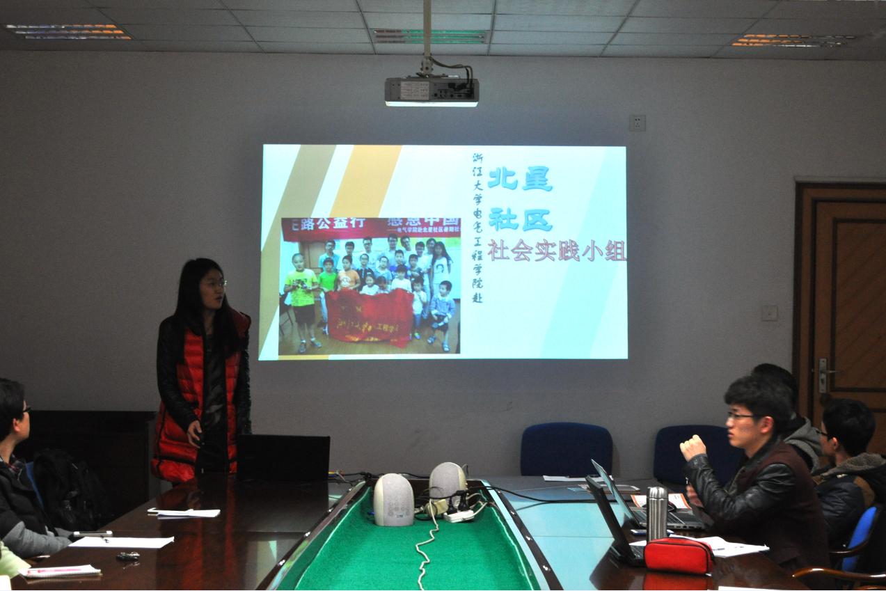 颁奖环节过后,主持人带领大家进入了优秀团队实践历程和实践成果的分享环节。本次会议中分享展示的三支队伍分别是赴浙江龙泉暑期社会实践团队、赴杭州北星社区暑期社会实践团队、赴上海、嘉兴暑期社会实践团队。其中赴浙江龙泉社会实践队伍代表重点介绍了实践内容,以“春泥课堂”为主,中间穿插了社会调研和基层挂职锻炼活动。精彩充实的展示取得了在场观众的热烈掌声。赴杭州北星社区社会实践队伍代表从项目立项策划开始,向大家交流了社会实践开展的整个过程和各个细节,通过丰富多彩的活动,为北星社区人们展示了电气学子的风采。以红色教育、红色文化寻访为主题的赴上海、嘉兴社会实践团队代表讲解非常生动精彩,带领大家观看精心准备的社会实践微视频,将会议气氛逐渐推向了高潮。通过这些优秀社会实践队伍的展示,同学们汲取了经验,对社会实践有了进一步的认识。