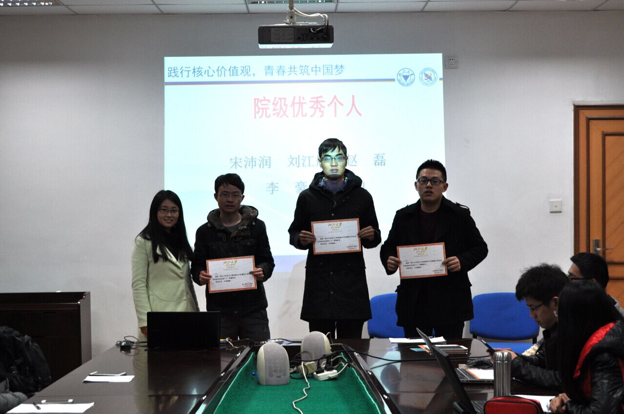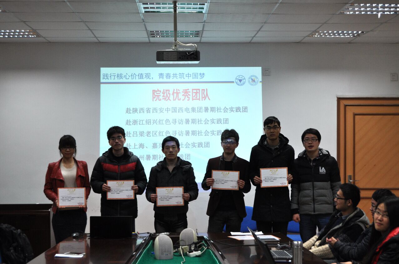 紧接着,会议进入第二个环节:表彰及优秀团队代表分享环节。本次大会对2015年暑期社会实践工作中获得校级优秀团队、校级先进个人、院级优秀团队、院级优秀个人、校级优秀论文的团队和个人进行了表彰,李涛和赵梓杉为获奖队伍和个人颁奖并合影留念。