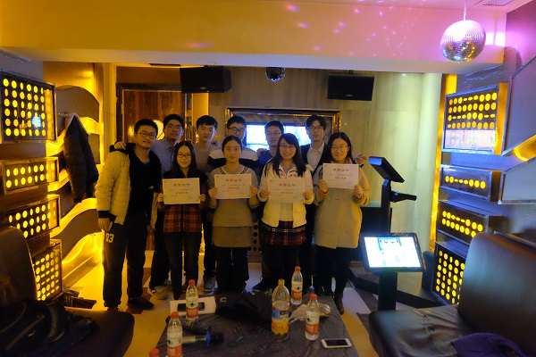 2、红歌比赛。参观结束之后的晚上,大家来到普乐迪进行了红歌比赛,首先我们根据实验室进行了分组,每组队伍选择一首红歌参赛,最后根据投票结果选出红歌比赛的优胜奖。比赛中各组激情洋溢地演唱了《精忠报国》,《军中绿花》,《团结就是力量》等歌曲,最后一首《歌唱祖国》,将气氛推向了高潮。