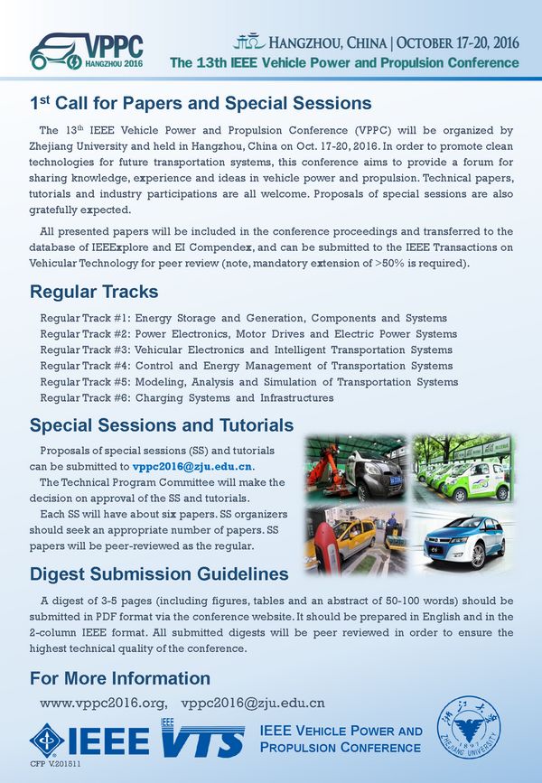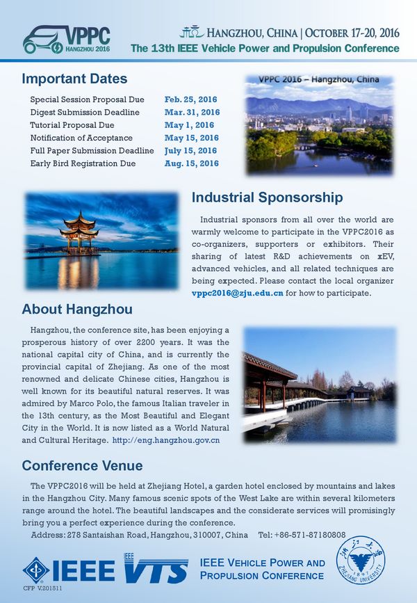 受IEEE 车辆技术协会(Vehicle Technology Society, VTS)邀请与委托,浙江大学电气工程学院将主办第13届IEEE国际车辆动力与驱动会议(The 13th IEEE Vehicle Power and Propulsion Conference, VPPC2016)。会议将于2016年10月17至20日在杭州举行,由电机学科负责具体办会工作。 IEEE VPPC是由IEEE VTS创办的车辆动力与驱动技术领域最高水平、最具规模的国际学术会议之一,长期以来致力于传播该领域的前沿技术进展、分享实践技术经验。 VPPC已在北美、欧洲、亚洲成功举办了12届。近年来,我国在新能源汽车以及交通运输的其他领域取得了突飞猛进的进展,而浙江大学电气工程学院在相关领域的科研工作也不断深化。此外,学院电机学科在2013、2014年成功举办了LDIA、ICEMS等高水平国际学术会议,进一步提升了学院、学科的国际声誉。有鉴于此,IEEE VTS委托电气工程学院主办本届VPPC国际会议。 届时,相关领域的国内外知名专家学者、企业界同行将齐聚西子湖畔,针对汽车整车技术、电机、电力电子驱动器、储能、充电、能量管理、电磁兼容、汽车电子、汽车及零部件建模仿真等主题展开充分的学术交流与讨论,以分享车辆动力与驱动技术领域的尖端研究成果,开拓视野、启迪众智,为新的突破与进展奠定基础。同时,通过大会的载体,电气工程学院将充分展示自身的科研实力与学科潜力,进一步提升学院的国际知名度与学术影响力,推动电气工程“高峰学科”的建设。 作为东道主,浙江大学电气工程学院竭诚欢迎国内外同行踊跃投稿、组稿,并向同行、学生积极宣传此次会议。详见会议网站www.vppc2016.org。 期待与您在2016金秋杭城共襄盛举!