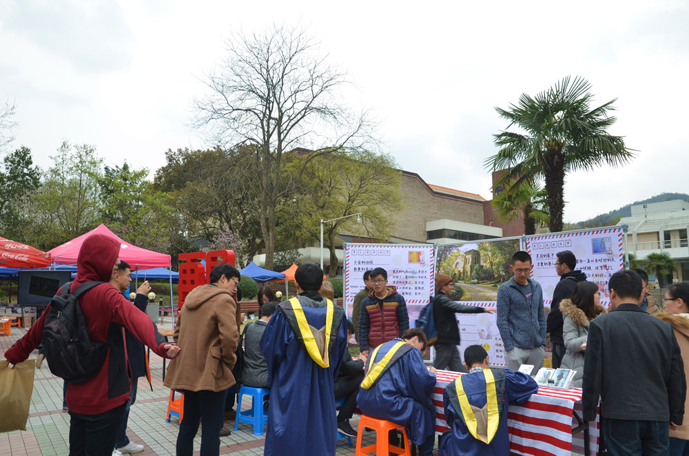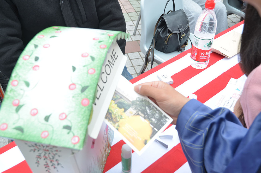 经过前期紧锣密鼓的布置,永谦广场被装扮得美轮美奂。活动场地中央是明信片区,几张桌子上浙大风格的明信片和趣味邮戳琳琅满目。明信片由同学们自行填写,再由工作人员负责邮寄,前100位邮寄的同学还会获得专属拍立得照片一张。场地左侧屹立着鲜红色的“再见浙大”的巨型落地字;落地字旁的显示屏反复滚动播放着照片,这些照片记载着即将毕业的浙大学子们在求是园中的点点滴滴。巨大的“校友证”矗立在场地右侧,落地字和校友证的布置都便于大家合影留念。