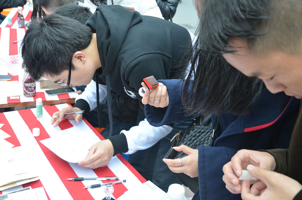 活动伊始就受到了同学们的关注,明信片区很快就座无虚席。随着活动进行,越来越多的同学加入到活动当中,即将毕业的学子们面对现场的布景深有感触,纷纷提笔在明信片上写下自己的祝福,小小的明信片,承载的是他们流露的真情。很多人也为校友证和落地字深深吸引,纷纷驻足合影留念,他们在校友证后露出最灿烂的笑容,在落地字旁摆出各种造型,用自己的方式留下美好的回忆。活动一直持续到下午两点,其间现场一直是摩肩接踵,熙熙攘攘。