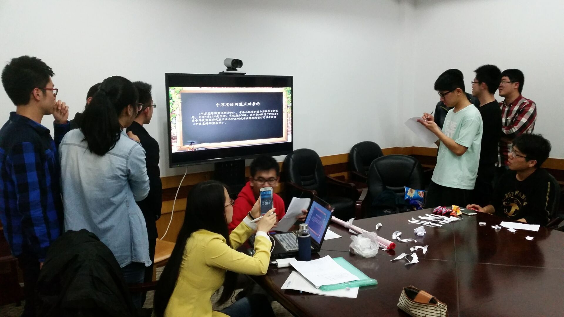 接下来的“联想无极限”环节则需要大家从给出的四到五个关键词中猜历史事件或人物,采用的是抢答方式,每个人都有机会。每一次题目给出,大家都异常活跃和自信。在“谁是默契王”环节中,选手们不再拘泥于字里行间的争分夺秒,更加入了肢体语言的互动,在竞猜“互不侵犯”一词时,台上的选手显然陷入了窘境,无法找到一个恰当的表达方式,诙谐的动作更是引得全场观众捧腹大笑。