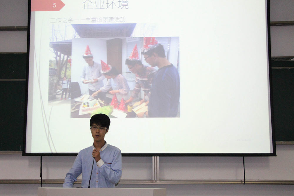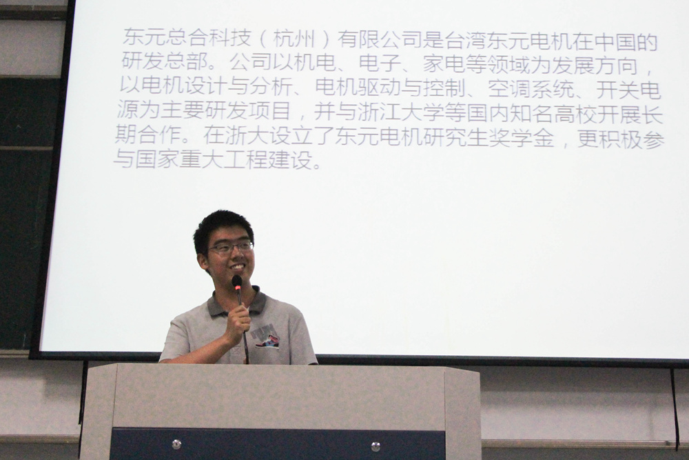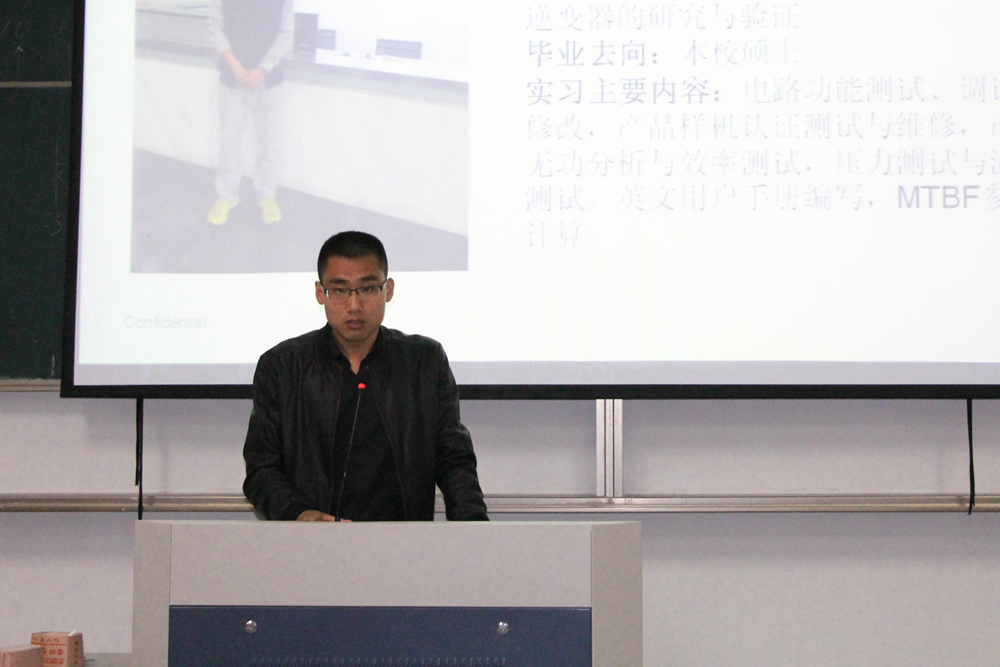 在各位老师的介绍讲解之后,大会还专门邀请了2012级电气专业、自动化专业、电信专业参加“卓越计划”试点工作的同学向与会的13级同学进行了实现经验分享。首先上台的是邓银秋,他从中国能建浙江院的实习概况、实习内容、实习环境、毕业设计选题、实习收获、对学弟学妹们的建议等几个方面向大家分享了自己“卓越计划”长时间实习的基本情况。第二位上台汇报的田乐则是结合自己对于实习单位东元总合科技(杭州)有限公司的认识和介绍阐述了自己参与“卓越计划”的收获与感悟。随后白天学长向大家介绍了自己在上海飞利浦公司的具体实习情况。最后谷恭山学长、程伟学长分别介绍了自己在台达电子和杭州中天微系统有限公司的实习情况。学长们的分享令在场的每一位同学都收获颇丰,也更加形象具体地认识到“卓越计划”的实质内容和相关要求。